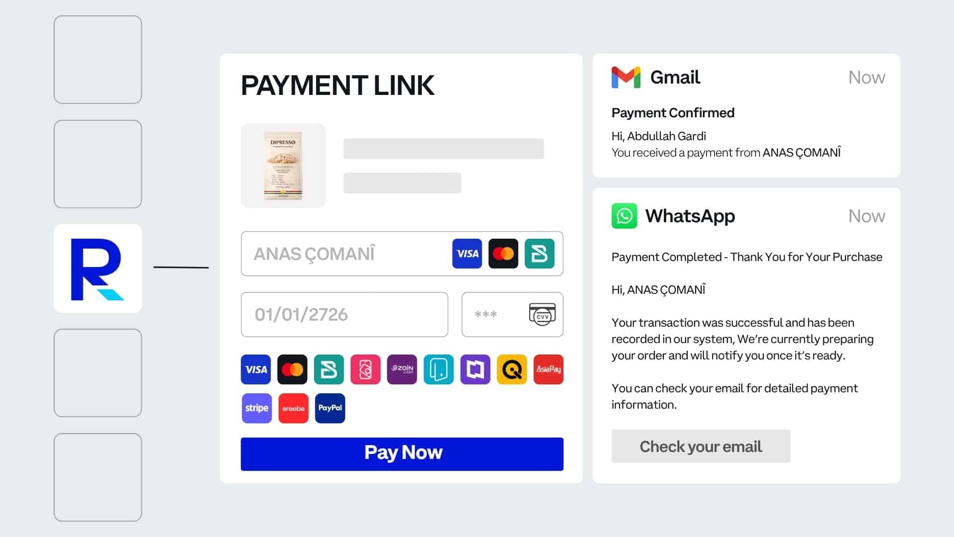 Your customers see a clean, mobile‑optimized payment page carrying your business name and branding. They can pay using their preferred method, receive instant receipts, and contact you with confidence knowing that their transaction is processed over RASEDI’s secure infrastructure.